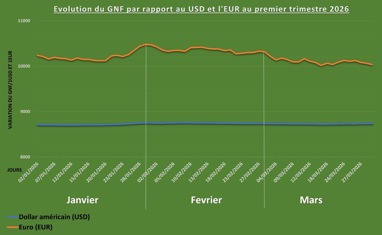 La situation financière de la Guinée présente une tendance baissière de la valeur du franc guinéen (GNF) face au dollar américain (USD) et à l’euro (EUR), sur le marché officiel des changes au premier trimestre de l’année 2026.